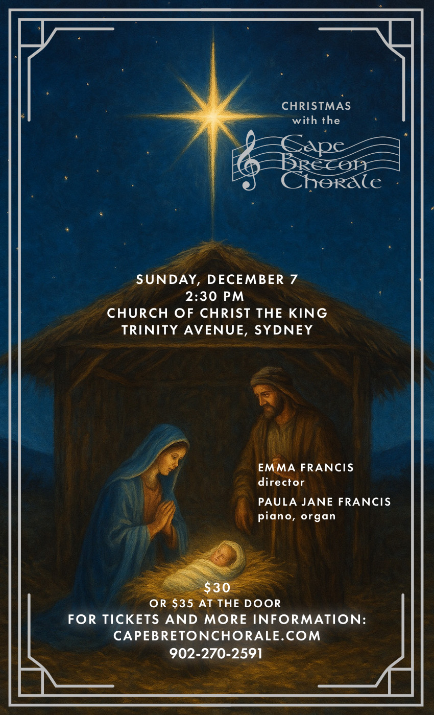 t’s the most wonderful time of the year! Don’t you find? The stores are bustling, the craft sales are in full-swing, and the local calendar is full of upcoming concerts and shows. A Star in the East: Christmas with the Cape Breton Chorale, happening Sunday, December 7 at 2:30pm at the Church of Christ the King in Sydney, is a concert that you will not want to miss.